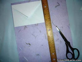 1. Выберите конверт и отрежьте полоску на 5-7 мм меньше ширины вашего конверта. Это будет основанием вашей открытки. Измерьте высоту конверта и отложите вниз на 5-7 мм меньше. Желательно не чертить карандашом, а острием ножниц провести полоску. Сильно не нажимайте. Эта полоска в последующем поможет вам легко сделать сгиб в нужном месте, оставив при этом чистый и профессионально эстетичный край. Дальше вам надо отложить еще две высоты вашей открытки. В нашем случае высота конверта 10 см, открытка в готовом виде около 9.5 см, поэтому отложите еще два раза примерно по 4 см. Как и в предыдущий раз, не делайте полосок карандашом, а острым концом ножниц проведите черту.